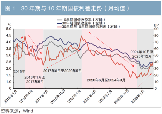 从近10年来30年期与10年期国债利差走势看,大致可以分为2015年(利差走阔)、2016年1月至2017年5月(利差收窄)、2017年6月至2020年5月(利差走阔)、2020年6月至2024年9月(利差收窄)、2024年10月至2025年12月(利差走阔)这五个阶段(见图1)。本文通过回顾这五个阶段30年期与10年期国债利差的变化过程,分析可能影响利差走势的因素,进而对后续该利差走势进行预测。