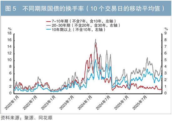 从供给来看,2023年以来,超长期国债供给对30年期与10年期国债利差的影响减弱。2016年,财政部建立了30年期国债的常态化续发机制,当时的超长期国债市场存量规模较小,且交易盘对如此长久期的30年期国债交易热情有限,30年期活跃券的成交活跃度整体不高。2024年以来,随着超长期特别国债发行机制进一步完善,30年期国债存量规模大幅提升,并且由于久期较长,30年期国债收益率在牛市中上涨较多,机构倾向于拉久期增厚收益,30年期国债成交活跃度明显上升,交易属性明显增强。
