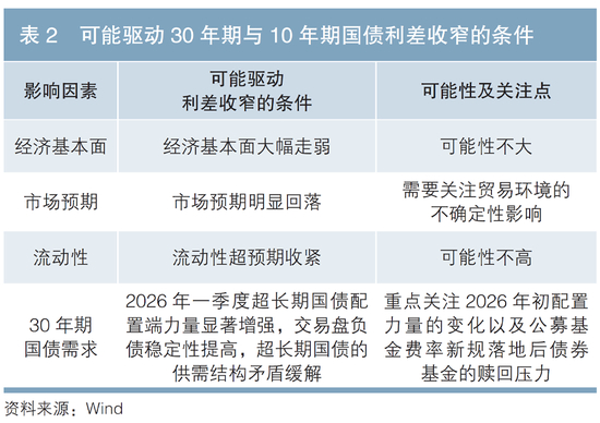 自2024年9月24日以来,30年期与10年期国债利差持续震荡走阔,尤其是2025年末配置力量缺位后,超长期国债供需结构矛盾凸显。2025年末,30年期与10年期国债利差进一步回升至40BP。结合前文总结的四个主要影响利差的因素来看,后续30年期与10年期国债利差若要收窄,可能还需要以下条件:一是经济基本面大幅走弱;二是市场预期明显回落;三是流动性超预期收紧,30年期国债在初期可能相对更有韧性,30年期与10年期国债利差或将呈现收窄态势;四是从需求来看,如果2026年一季度超长期国债的配置端力量显著增强,交易盘负债稳定性提高,超长期国债的供需结构矛盾改善可能有利于30年期与10年期国债利差收窄(见表2)。