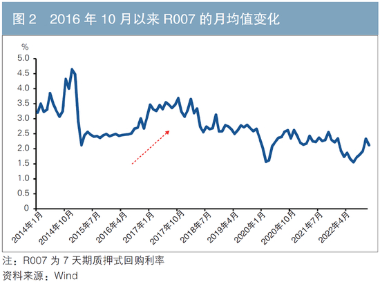 2016年1月至10月,在“资产荒”的影响下,资金大量涌入债券市场,长久期的30年期国债因其配置价值突出,收益率下行幅度显著大于10年期国债,使得二者利差持续收窄。同年10月后,随着货币政策与监管环境趋紧、金融去杠杆政策逐步出台,市场流动性预期收紧,资金面趋于收敛(见图2)。在此过程中,对流动性更为敏感的10年期国债收益率快速上行,而30年期国债因配置需求支撑,上行幅度相对平缓,进一步加速了期限利差收窄。