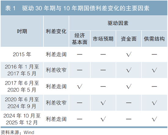 本文通过回顾2015年以来不同阶段驱动30年期与10年期国债利差走势的因素,认为期限利差主要受到经济基本面、市场预期、流动性及供需结构等因素影响,并且不同阶段的影响因素并不相同(见表1)。