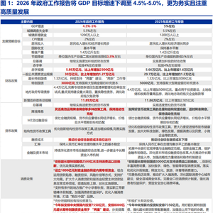 今年两会延续稳增长、防风险、促转型的政策主线,整体政策目标更为务实,也更加突出改革转型。2026年政府工作报告中将今年GDP目标增速定为4.5%-5%的区间范围,相比去年5%左右有所下调,但不代表财政力度减弱。
