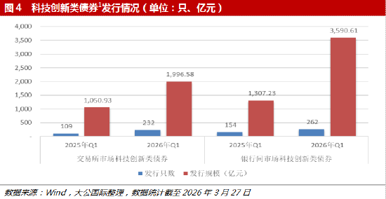 一季度,科技创新类债券延续强劲增长态势。全市场合计发行科技创新类债券494只,较2025年同期增长87.8%;发行规模5,587.19亿元,同比大幅增长136.93%,债券市场服务创新驱动发展战略的效能持续提升。分市场看,交易所市场发行科技创新债券232只、规模1,996.58亿元,同比分别增长112.84%和89.98%;银行间市场发行262只、规模3,590.61亿元,同比分别增长70.13%和174.67%。