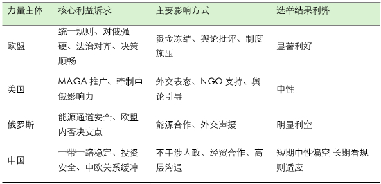 这场选举从一开始就不是单纯的内政。欧盟、美国、俄罗斯、中国四方利益在此深度交织,每一方都有清晰诉求,也潜移默化的影响选举走向。