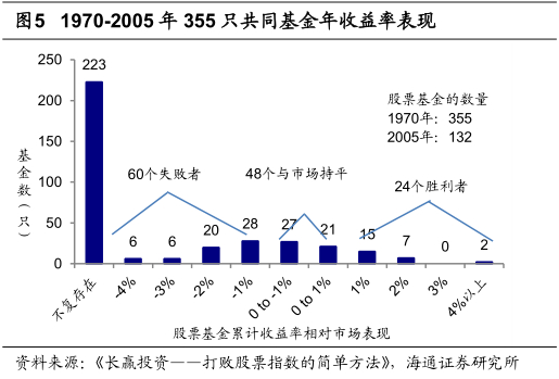 根据《长赢投资—打败股票指数的简单方法》的统计,创建于1970年的355只股权基金,在此后36年的业绩发展中,有223只基金走向消亡,占比接近2/3,可以大胆推算这些基金的共同特征是业绩较差。而在剩下的基金中,也有60只年收益率也远落后标普500指数,差距超过1%。