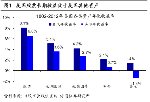 美国股市有200多年历史,根据《股市长线法宝》,对比分析1802-2012年美国大类资产年化收益率,考虑利息再投资的情况下,股票、长期国债、短期国债、黄金、美元的名义年化收益率分别为8.1%、5.1%、4.2%、2.1%、1.4%,扣除通胀后的实际收益率分别为6.6%、3.6%、2.7%、0.7%、-1.4%。长期来看,美国股票的收益率远超过其他的大类资产。