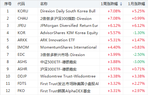 区域ETF方面,大A股扛起了上涨重任,多只做多沪深300指数和中证500指数的ETF排上涨幅榜,其中CHAU尽管只有2倍杠杆,涨幅却与3倍杠杆的KORU不相上下。