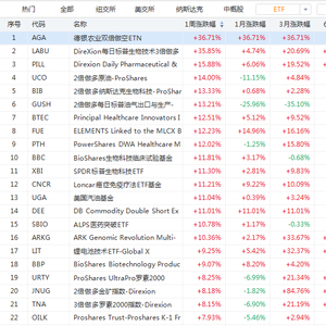其中,每日3倍做多标普生物技术指数的LABU为上周表现最佳的ETF,一周累计涨幅近36%,其追踪指数成分股包括近期大热的疫苗股诺瓦瓦克斯医药。