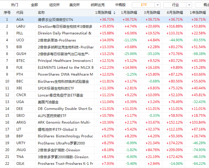 除了占据涨幅榜中多数席位的医药类ETF,原油相关ETF、金矿ETF、代表小盘股的罗素2000指数ETF也都表现领先。(AGA、DEE已终止交易)