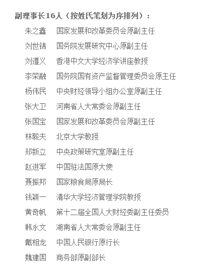 黄奇帆是16位副理事长之一,其他15人很多人也耳熟能详,有国家发改委原副主任朱之鑫、中财办原副主任杨伟民、北大教授林毅夫、央行原行长戴相龙。