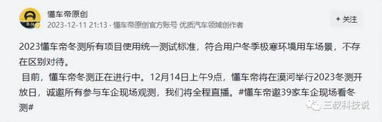 懂车帝原创发文表示,2023懂车帝冬测所有项目使用统一测试标准,符合用户冬季极寒环境用车场景,不存在区别对待。