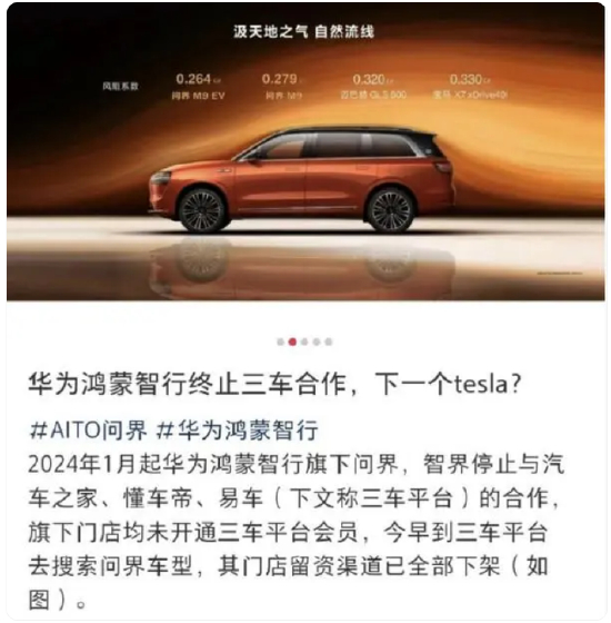 1月3日,有消息称华为鸿蒙智行旗下问界、智界与汽车之家、懂车帝、易车三大汽车平台的合作关系已经终止。这一消息在汽车行业引起了不小的震动。据悉,华为已主动停止与这三家平台的合作,旗下门店也未再开通相关会员服务。如今,用户在各大汽车平台搜索问界车型时,已无法找到相关门店的留资渠道。有猜测认为,鸿蒙智行或许会自建APP。