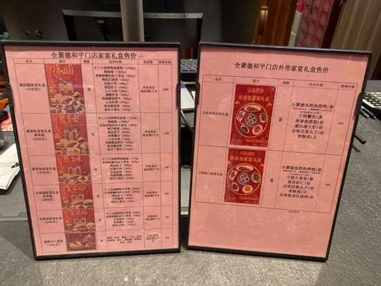 此外,全聚德还把年夜饭外卖玩出了新花样。记者在门店看到,全聚德推出了年夜饭预制菜礼盒,其礼盒规格在1500克-7540克不等,售价在388元-1888元。据门店销售人员介绍,顾客现场下单,门店制作好后会通知顾客取货,产品冷冻保存保质期为9个月。