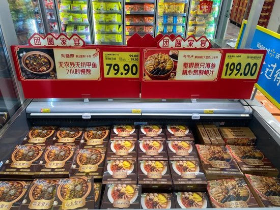 除了具有河南本地特色的“扣碗”,放到哪里都能成为“镇桌硬菜”的高端预制菜产品也成了各大商超的“新春宠儿”。在北京一家超市食品销售区,“霸王鳖鸡”“佛跳墙”“羊蝎子”“猪肚鸡”等一道道“镇桌硬菜”早已准备妥当。