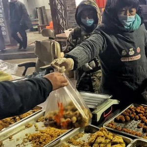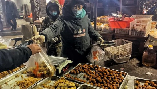 2月7日(腊月二十八)晚九点多,河南南阳一家餐厅外顾客选购炸货,用作年夜饭“扣碗”食材