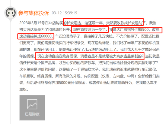 深蓝汽车在黑猫投诉上留意到,近日,长安逸达遭到车主大量投诉。一位投诉者称,他在2023年5月购买的长安逸达,在不到一年的时间,突然改款成长安逸动,而他当初购买逸达的原因就是为了和逸动区别开来。更让他生气的是,长安逸达的厂家指导价为9.89万元,改成逸动后直接跌至6万元,不光价格掉了,配置还比逸达高,“我们花大几千才能延保两年的质保,现在逸动直接送终身质保,消费者是不是就是被大商家当韭菜割的?”