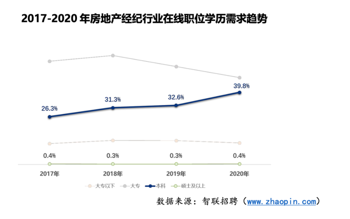 智联招聘近期发布的一份报告显示,2017-2020 年,房地产经纪行业本科及以上人才需求占比由26.7%上涨到40.2%,房地产经纪行业整体人才质量提升需求迫切。