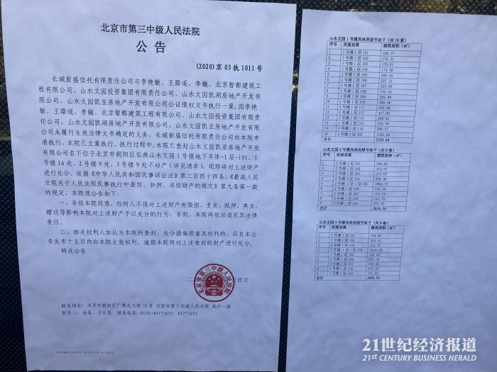 如今,烂尾项目里的毛坯房还被施工单位贴上了封条以示拖欠工程款的不满,山水美术馆和李可染艺术基金会美术馆等底商门口亦于2020年11月4日被贴上了法院的强制执行告示,申请执行人赫然写着长城新盛信托,被执行人便是山水文园项目的开发商山水文园凯亚房地产开发有限公司(下称凯亚)。
