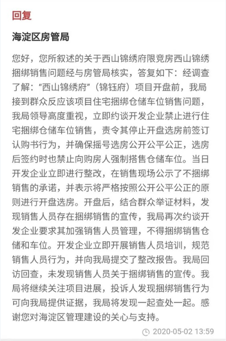虽然有法可依,但在实际处理中购房人却进退两难。我们从人民网领导留言板上看到,早在今年4月底就有客户对该项目搭售情况进行投诉,而海淀房管局也对此给与了回复。
