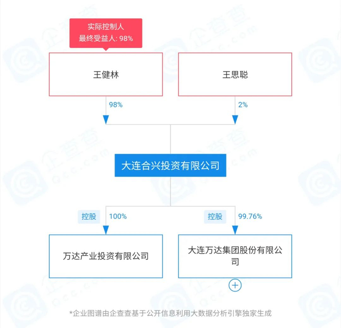 后者是由王健林和他儿子王思聪分别持股98%、2%的公司,同时持股大连万达集团99.76%,是大连万达集团的控股公司。