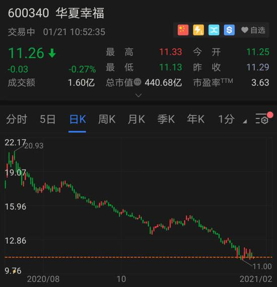 伴随着华夏幸福业绩大幅倒退,2020年下半年以来,企业股价不断走低,截至1月21日早盘已跌至11.26元,创2015年以来新低,相较2020年7月的20.93元高价下跌近50%,市值蒸发超400亿元;相较平安入股时的股价,更是跌去近6成。