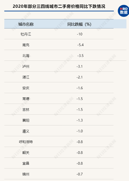 1月中旬,国家统计局公布的2020年12月房价数据显示,包括牡丹江、南充、北海、泸州、湛江等在内的14个三四线城市,其二手房价格跌回到了一年前。