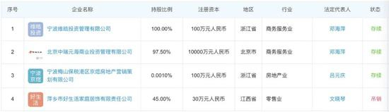 目前,邓海萍仅对外投资4家企业,除了中瑞元海,还包括了宁波维皓投资管理有限公司(持股100%)、宁波梅山保税港区京煜房地产营销策划有限公司(持股0.001%)和萍乡市好生活家庭居饰有限责任公司(现已“注销”)。