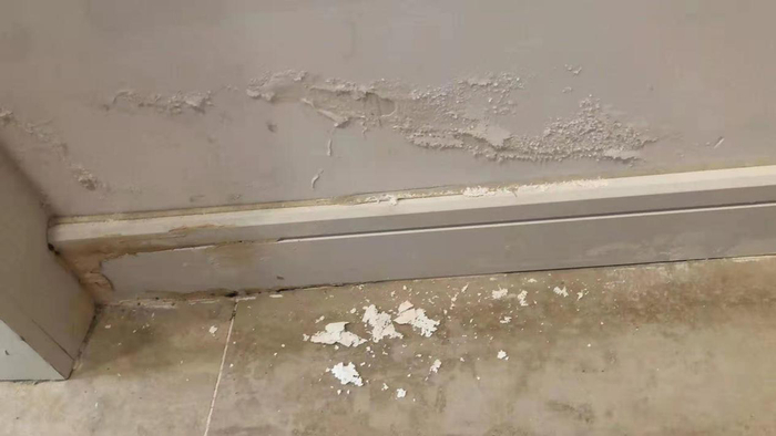 多位业主代表向记者表示,在本批次交房的3、4、5栋公寓中,超一半的房屋都存在不同程度的渗水、返潮以及空鼓等现象,甚至个别的房屋油烟机管道破损断裂、未安装热水管、马桶开关掉落、插座面板缺失等多样的问题,装修问题百出。