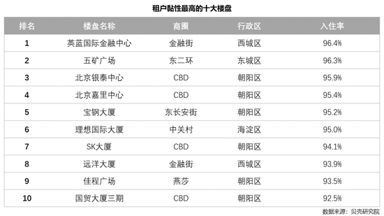 楼盘入住率代表了租户黏性程度。和租金预期强度榜单相同,本榜单所有上榜楼盘均为甲级写字楼,其中位于CBD商圈的楼盘有四个,两个位于金融街,东二环、东长安街、中关村和燕莎均有一个楼盘上榜。本榜单仅统计目前出现在贝壳商办平台上的楼盘,长期满租或由业主全自用的楼盘不在本次统计范围内。