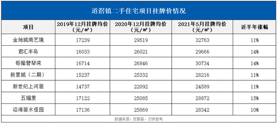 2020年,道滘镇多个二手房项目挂牌价涨幅都超过50%以上,包括金地城南艺境、新世纪君汇半岛、钜隆碧琴湾、新里城(二期)等,随着调控收紧,近半年的挂牌涨幅也普遍在10%以上。