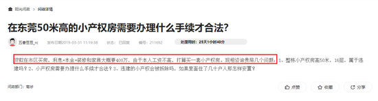 当中房君问及什么人会购买时,该位中介回复道,主要为自住的多,大部分为无力承担商品房价格的买家。从阳光问政平台来看,被高房价劝退看向东莞小产权房的确实不在少数,相关风险也成为购房者的主要担忧点。