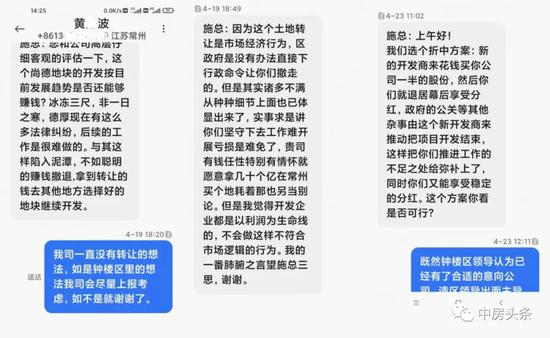 2021年4月,德厚地产负责人施经理接到自称是来自当地政府的黄某波的“劝退”短信。知情人士透露,此事实则钟楼区政府通过招商部门工作人员私下对德厚地产负责人施经理进行劝退,意在让德厚地产将剩余未开发土地全部转让给政府指定公司。