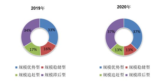 结果显示,到2020年,上市房企中,规模优势型、规模滞后型企业两类房企较上年有所上升,均约37%,规模稳健型、规模追赶型企业均占比约13%,占比较上年有所下降。