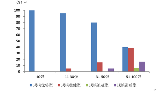 同时,测评报告将不同位次上市房企进行比较,结果显示,10强、11-30强、31-50强、51-100强上市房企中,绝大多数为规模优势型企业。
