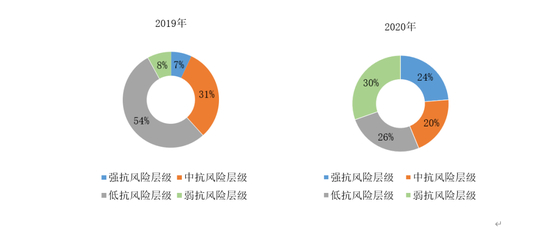 2020年,综合剔除预收账款后的资产负债率、净负债率、现金短债比、流动比率、速动比率等指标分析得出,强抗风险层级和中抗风险层级的企业分别约占上市房企总量的24%和20%,合计占44%。