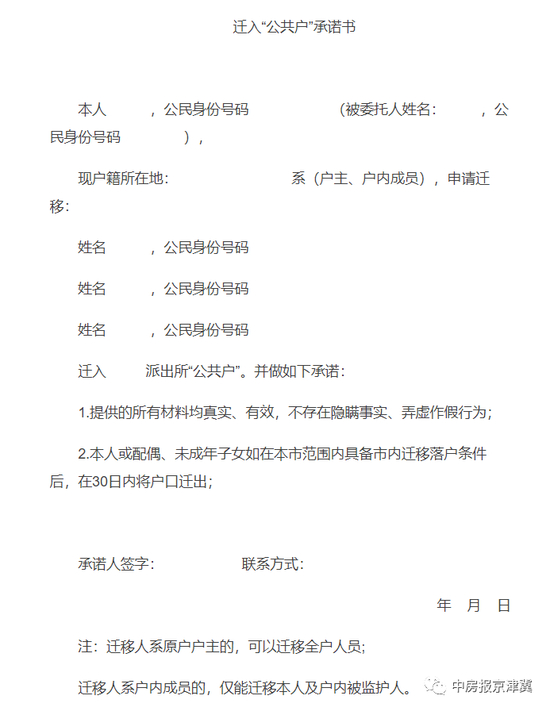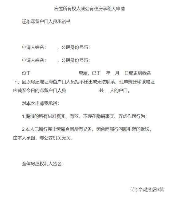 我们了解到,申请人需要本人带房本和身份证到房屋所在派出所,现场签署一份派出所提供的《房屋所有权人或公有住房承租人申请迁移滞留户口人员承诺书》,然后现场工作人员会指导申请人手写一份申请,最后将承诺书和申请一并提交派出所即可,整个办理过程也就十分钟左右。