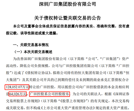 广田集团称,为改善公司资产流动性、降低公司负债规模,公司与广田控股达成了《债权转让协议》,拟将公司持有的恒大集团及其关联公司开具的已到期待偿付及未到期的商业承兑汇票债权合计12.8亿元转让给广田控股,用以抵偿公司向广田控股借款的本金及相应利息6.4亿元。