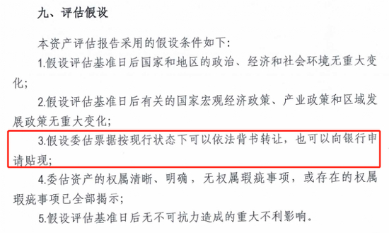 不过,中国基金报记者注意到,这份评估报告基于一条“关键”假设,即“假设委估票据按现行状态下可以依法背书转让,也可以向银行申请贴现”。