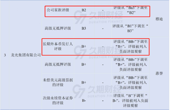 3月7日穆迪和惠誉同时下调,穆迪将龙光集团的公司家族评级从“Ba3”下调至“B2”,穆迪对该评级的定义是“缺少理想投资的品质还本付息,或长期内履行合同中其它条款的保证极小”,高级无抵押评级也下调到了“B3”。惠誉则将公司长期外本币发行人评级从“BB-”下调至“B+”,其他细分评级也一并下调,同时所有评级继续列入负面观察。