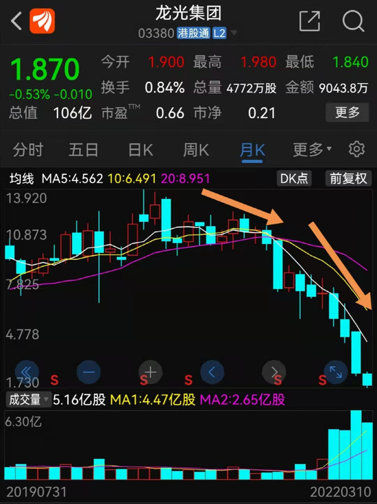 股价来看,在港上市的龙光集团1月27日暴跌16%,1月28日继续暴跌11%;2月15日跌12%;2月24日跌14.5%,2月25日再跌16%;3月8日也就是本周二,又暴跌13%。这样进入2022年,龙光集团股价累计跌幅达到68%,如果以一年半前的高点计算,跌幅则高达87%,市值增发掉700亿,仅剩106亿港元,市净率只有0.21。