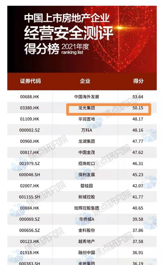 2021年12月31日,一家地产第三方研究机构发布“中国上市房地产企业经营安全测评得分榜(2021年度)”,龙光集团罕见排名第二,得分达到50.15分,与排名榜首的中海地产成为唯二得分过50分的企业,两家共同组成了第一梯队。