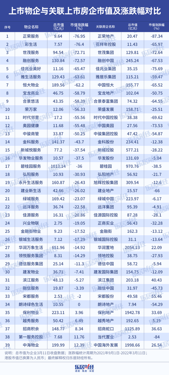 乐居财经统计了39家物企对应的关联房企市值及涨跌幅情况,物企与关联房企的涨跌幅情况基本呈现正相关。其中,跌幅最高的是正荣服务,达76.95%,与关联房企正荣地产87.34%的跌幅基本一致。