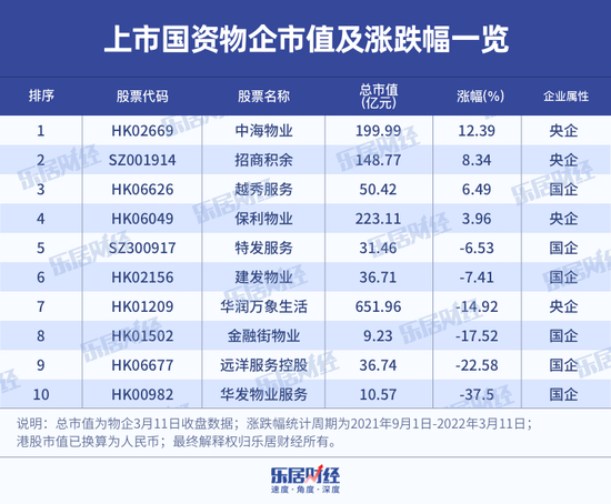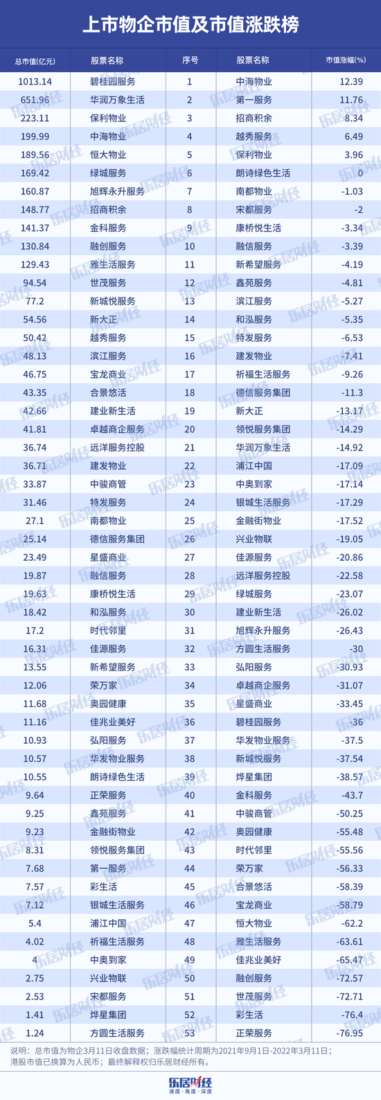 以53家上市物企为样本,自去年9月1日至今年3月11日期间,仅6家物企市值保持正向增长或持平,其余47家物企均出现不同程度的下跌,平均跌幅达25%,反超地产板块平均12.44%的跌幅。
