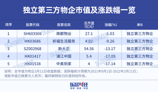 在这场地产寒冬之中,除了国资物企在股价上一定程度上保持了逆势而行,还有5家没有地产做靠山的独立第三方物企,走出了“特立独行”的步伐。它们在物业股整体走低的颓势下,虽未能摆脱下挫的影响,但其平均11.54%跌幅依旧远低于整体25%的跌势。