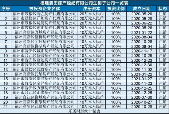 实际上,福建金诚丰的注销并非偶然事件。在福州市场上,福建麦田房产经纪(麦田控股全资子公司),旗下21家全资子公司在今年2月迎来了集中注销潮,其中大部分企业为2020年才刚刚成立。