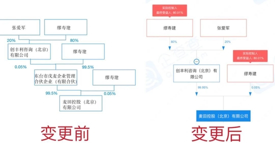也就是说,麦田控股经过此次变更,缪寿建的最终持股份额从99.99%下降至80.01%,而张爱军的持股比例则上升至19.99%。
