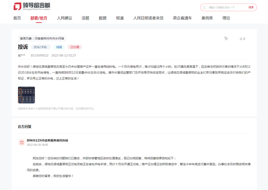 面对临电及供暖问题,业主也向领导留言板及郑州房管局进行投诉,两部门官方回复临电问题将会在2022年10月、12月底整改完成,开通正式电。目前已进入10月份,但业主并没有收到开发商的改电通知,多次与项目方沟通,相关置业顾问便以“公司没钱”推诿。供暖问题,相关部门回应市政供暖管网目前还没有通过。而距离花语城较近、同期交付的永威城、绿都澜湾项目早已通暖且使用的均为正式水电。