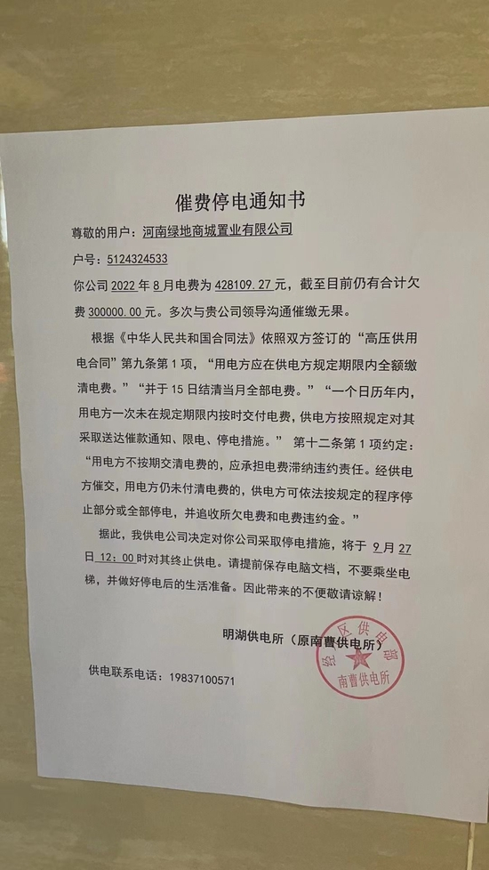 业主李女士表示目前开发商临时用电交房的行为业主难以接受,乐居新媒体了解到,绿地花语城目前已交房的一期水泽苑、盈翠苑,二期清风苑,均使用临电,夏季频繁停电、检修送电不及时的情况时有发生,且河南绿地商城置业有限公司甚至有拖欠供电所电费的行为,居民无辜被停电、停水,电梯不能使用,严重影响了小区业主的日常生活。