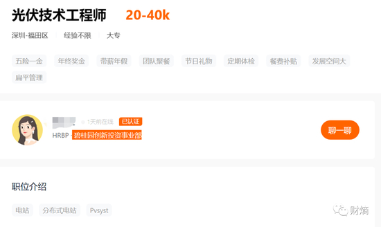 碧桂园创投为碧桂园直属股权投资事业部,负责集团除地产投资外所有股权投资业务。财熵留意到,在一个招聘平台上,类似“光伏系统工程师”、“光伏设计技术专员”、光伏电站方向的“业务开发经理”等岗位已经同时挂在碧桂园和碧桂园创投的页面上,工作地点分布在深圳、广州、北京。对比集团的其他待招岗位,这些光伏岗位的薪资水平较高。