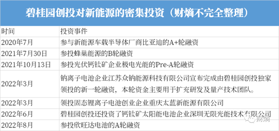 2020年7月,碧桂园创投参与比亚迪的A+轮融资,悄悄打响其在新能源领域投资的第一枪。据财熵对碧桂园创投已公开投资的统计,这两年间其至少对新能源产业累计投资7宗,其中光伏产业相关投资有2宗——无锡极电光能科技有限公司、深圳无限光能技术有限公司,均为专注钙钛矿电池生产的企业。